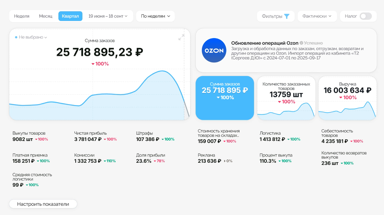Уже готова основа — профессиональная аналитика Ozon и WB в простом интерфейсе. Скоро добавим автоматизации, множество интеграций и AI-инструменты.