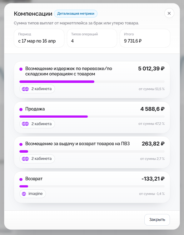 Вы можете увидеть, из каких операций сформирована метрика, по каким кабинетам она распределена и какие суммы участвуют в расчёте.